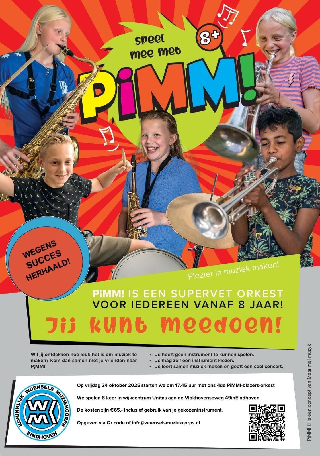 Het leerlingenorkest van het Koninklijk Woensels Muziekcorps is in het voorjaar van 2024 ontstaan uit het succesvolle PiMM’s-project (Plezier in Muziek Maken). Dit initiatief, dat kinderen op jonge leeftijd laat kennismaken met de magie van muziek, vormt de perfecte opstap voor beginnende muzikanten.
